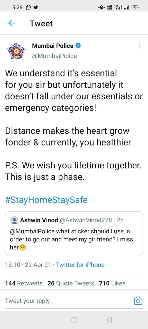 পুলিশের এই সিদ্ধান্তের পর অনেকেই ফোন করে বা সোশ্যাল মিডিয়ায় মুম্বই পুলিশের কাছ থেকে জানতে চেয়েছেন, কোনও দরকারে বেরোলে গাড়িতে কোন রঙের স্টিকার লাগাতে হবে ? আর এই তালিকায় রয়েছে অশ্বিন বিনোদ নামে এক যুবকও। মুম্বইয়ের বাসিন্দা অশ্বিন বিনোদ (Ashwin Vinod) মুম্বই পুলিশের twitter হ্যান্ডেলে একটি অদ্ভুত প্রশ্ন করেছেন। বিনোদ লিখেছেন, বান্ধবীর সঙ্গে দেখা করতে যাওয়ার জন্য গাড়িতে কী রঙের স্টিকার ব্যবহার করব ? ওকে খুব মিস করছি। এই প্রশ্নের জবাবে মুম্বই পুলিশের তরফে জানানো হয়, আমরা বুঝতে পারছি এটা আপনার জন্য খুবই দরকারি। কিন্তু দুর্ভাগ্যবশত, এই বিষয়টি আমাদের জরুরি পরিষেবার মধ্যে পড়ে না। দূরত্বের ফলে হৃদয়ের টান বাড়ে। আর এই বিধিনিষেধ বর্তমানে আপনাকে সুস্থ থাকতেও সাহায্য করবে। সারাজীবন একসঙ্গে থাকার জন্য প্রার্থনা জানাচ্ছি।