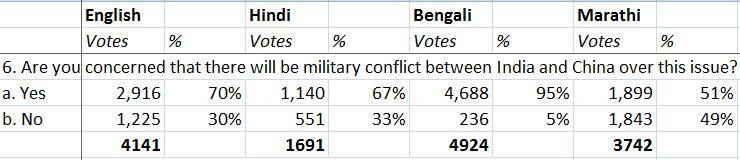 বাংলা ভাষায় যাঁরা এই সমীক্ষায় অংশ নিয়েছেন, তাঁদের মধ্যে ৯৫ শতাংশই ভারত- চিনের মধ্যে সামরিক সংঘাতের সম্ভাবনা রয়েছে বলে আশঙ্কা প্রকাশ করেছেন৷