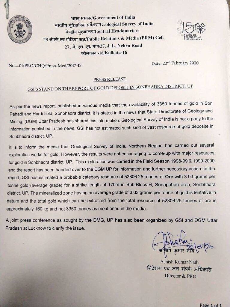 সোনভদ্রে কোনও খনিতে ৩০০০ টন সোনা উদ্ধার হয়নি ! জানালেন GSI-র ডিরেক্টর জেনারেল