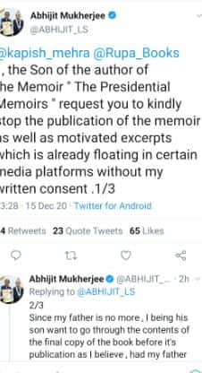 প্রণব মুখোপাধ্যায়ের পুত্র অভিজিৎ মুখোপাধ্যায় ট্যুইটে লিখেছেন, ‘আমি প্রণব মুখোপাধ্যায়ের পুত্র অভিজিৎ মুখোপাধ্যায় ৷ আমি চাই, আমার বাবা প্রণব মুখোপাধ্যায়ের লেখা দ্য প্রেসিডেন্সিয়াল মেমোরি’র প্রকাশনা বন্ধ করা হোক ৷ প্রথমে আমি ওই বইটি ভালো করে পড়ে দেখবে, ত্রুটি থাকলে সেগুলো সংশোধন করব, তবে সেই বই প্রকাশ করার অনুমতি মিলবে ৷ বাবা বেঁচে থাকলেও এমনিটই চাইতেন !’
