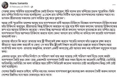 ব্রেন স্ট্রোকের কারণে গুরুতর অসুস্থ অযোধ্যার রাম মন্দিরের প্রধান পুরোহিত ৮৫ বছরের আচার্য সত্যেন্দ্র দাস সঞ্জয় গান্ধী পোস্ট গ্র্যাজুয়েট ইন্সটিটিউট অফ মেডিক্যাল সায়েন্সেস হাসপাতালে ২ ফেব্রুয়ারি, ২০২৫-এ ভর্তি করা হয়। এরই মধ্যে, ভাইরাল ছবিটি শেয়ার করে বিদ্রূপাত্মক ভাবে এক ফেসবুক ব্যবহারকারী দাবি করেছেন ক্যাপশনে, “গেরুয়া বসন পরিহিত ভদ্রলোকটিকে কেউ চিনতে পারছেন? ইনি হলেন রাম মন্দিরের প্রধান পুরোহিত। তিনি রাম মন্দির নির্মাণের সময় বলেছিলেন,”এ দেশে রাম মন্দির নির্মীত হলে,আর হাসপাতালের দরকার পরবে না।ভগবান শ্রীরামচন্দ্র সকলের রোগ সারিয়ে সুস্থ করে তুলবেন”।আজ সেই পুরোহিত মহাশয় অসুস্থ হয়ে হাসপাতালে ভর্তি আছেন…”