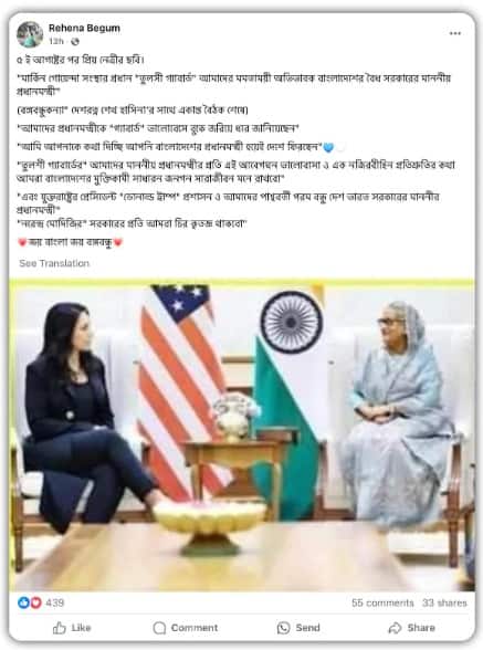 ছবিটি পোস্ট করে দাবি করা হচ্ছে যে, ভারতে অবস্থানরত শেখ হাসিনা নাকি তুলসী গ্যাবার্ডের সঙ্গে দেখা করেছেন। সেই সঙ্গে গ্যাবার্ড তাঁকে কথা দিয়েছেন যে প্রধানমন্ত্রী হিসেবে তাঁকেই তিনি বাংলাদেশে ফেরাবেন।