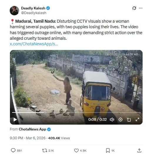 চেন্নাই : তামিলনাড়ুর মাদুরাইয়ের একটি মর্মান্তিক সিসিটিভি ফুটেজে নিরীহ পশুদের উপর নিষ্ঠুর আচরণ দেখে উত্তাল সোশ্যাল মিডিয়া। ক্লিপটিতে দেখা যাচ্ছে একজন মহিলা ছোট কুকুরছানা তুলে নিষ্ঠুরভাবে তাঁর প্রতিবেশীর বাড়ির কাছে একটি দেওয়ালে ছুঁড়ে মারছেন। এই নৃশংস ফুটেজটি দ্রুত সোশ্যাল মিডিয়ায় ছড়িয়ে পড়ে, যার ফলে বহু নেটিজেন ক্ষুব্ধ হন এবং অভিযুক্তর বিরুদ্ধে কঠোর ব্যবস্থা নেওয়ার দাবি জানান। পরে প্রকাশিত প্রতিবেদনে নিশ্চিত করা হয় যে মহিলার আক্রমণে দু’টি কুকুরছানা মারা গিয়েছে, যা জনসাধারণের ক্ষোভকে আরও বাড়িয়ে তুলেছে।