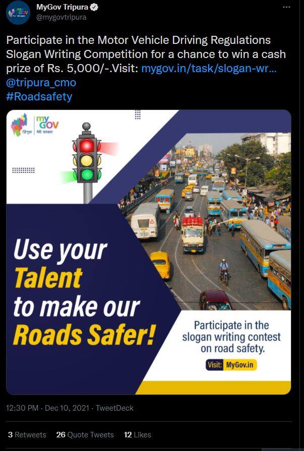 যান চলাচল নিয়ে সতর্কতামূলক প্রচারের জন্য স্লোগান লেখার প্রতিযোগিতা শুরু করেছে ত্রিপুরা সরকার৷ এই প্রতিযোগিতার কথা সবাইকে জানাতেই শুক্রবার একটি ট্যুইট করা হয় ত্রিপুরা সরকারের তরফে৷ সেই ট্যুইটেই আগরতলার পথঘাটের কোনও ছবি ব্যবহার না করে ব্যস্ত শিয়ালদহ উড়ালপুলের ছবি দিয়ে দেওয়া হয়েছে৷ শুক্রবার দুপুর সাড়ে বারোটা নাগাদ এই ট্যুইট করা হলেও এ দিন সকাল পর্যন্ত তা সরানো হয়নি৷ যদিও ত্রিপুুরা সরকারের তরফেই এই ট্যুইট করা হয়েছে নাকি কোনও এজেন্সি এই ভুল করল, তা এখনও স্পষ্ট নয়৷