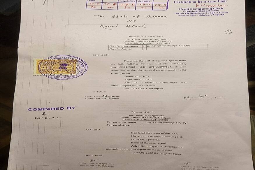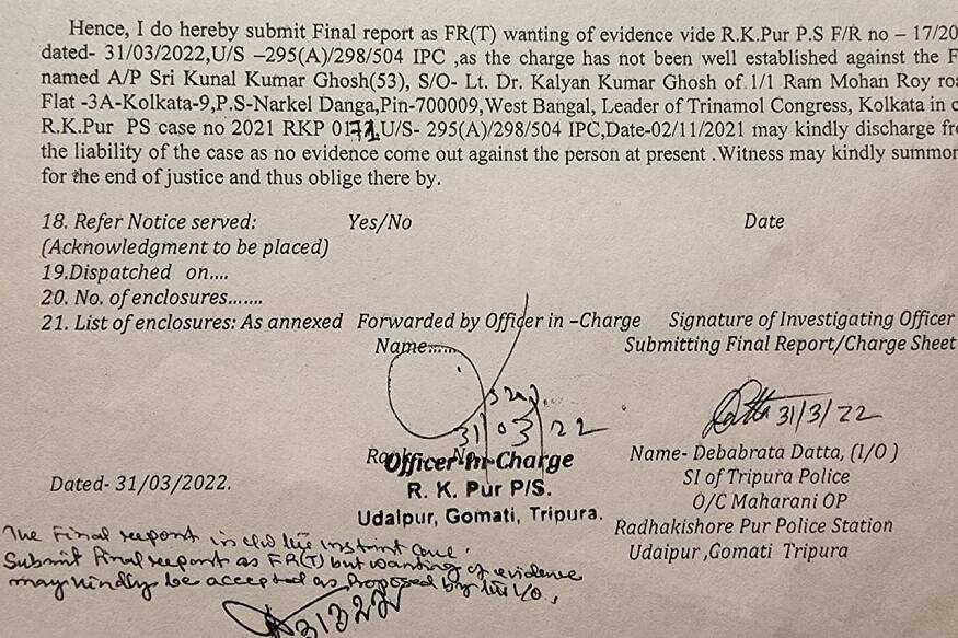 উল্লেখ্য, একই অভিযোগে ত্রিপুরার একাধিক থানায় কুণালের বিরুদ্ধে মামলা করেছে বিজেপি সরকারের পুলিশ। সোমবারেই অমরপুর কোর্টে উপস্থিত হন তিনি। এখানকার তিনটি মামলাতেই জামিন পান। এদিকে হুবহু একই অভিযোগে করা আর কে পুর থানার মামলায় পুলিশ কুণালকে অপরাধমুক্ত জানাল।