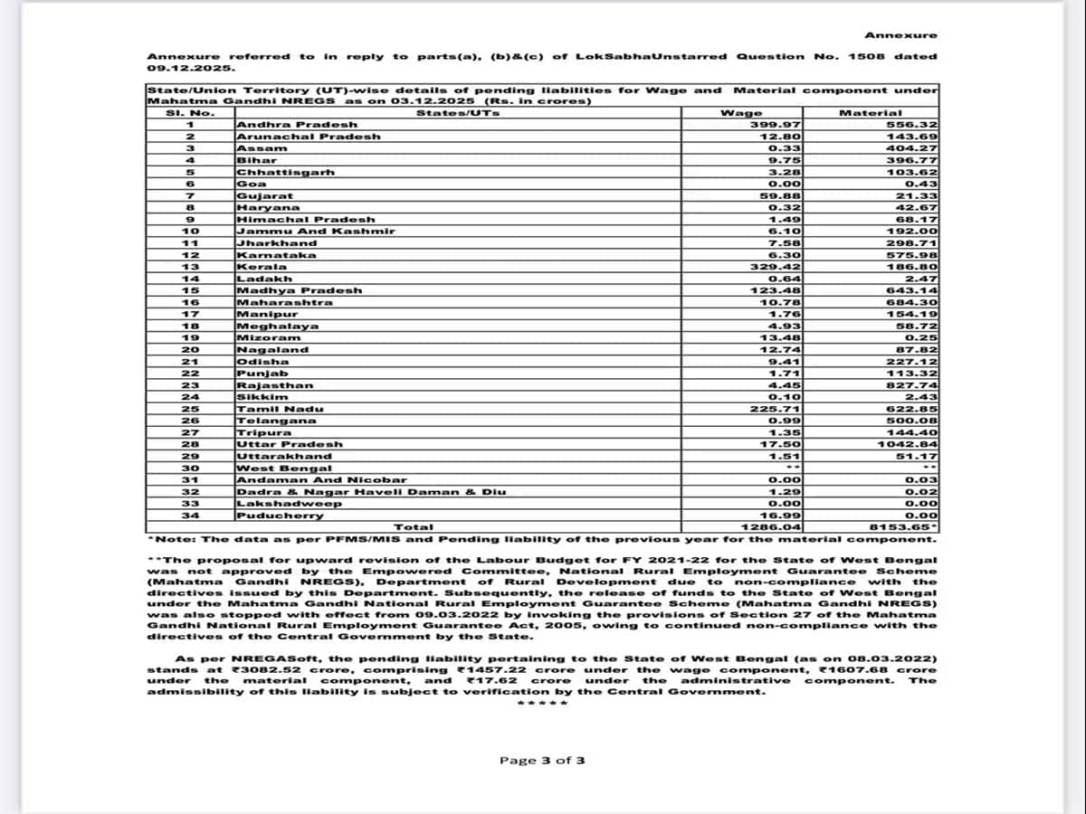 লোকসভায় অভিষেক বন্দোপাধ্যায় জানতে চেয়েছিলেন, ২০২৫ সালের অক্টোবর মাস পর্যন্ত ১০০ দিনের কাজে কোন রাজ্যের কত টাকা বকেয়া রয়েছে। রাজ্যগুলির বকেয়া মেটাতে কত সময় নেওয়া হয়েছে। সেপ্টেম্বর ২০২৫ পর্যন্ত ১০০ দিনের কাজে ব্যবহৃত পণ্যের বকেয়া কত? সময় মত বেতন মিটিয়ে দেওয়ার কোনও পরিসংখ্যান রয়েছে কি? থাকলে প্রকাশ করা হোক।