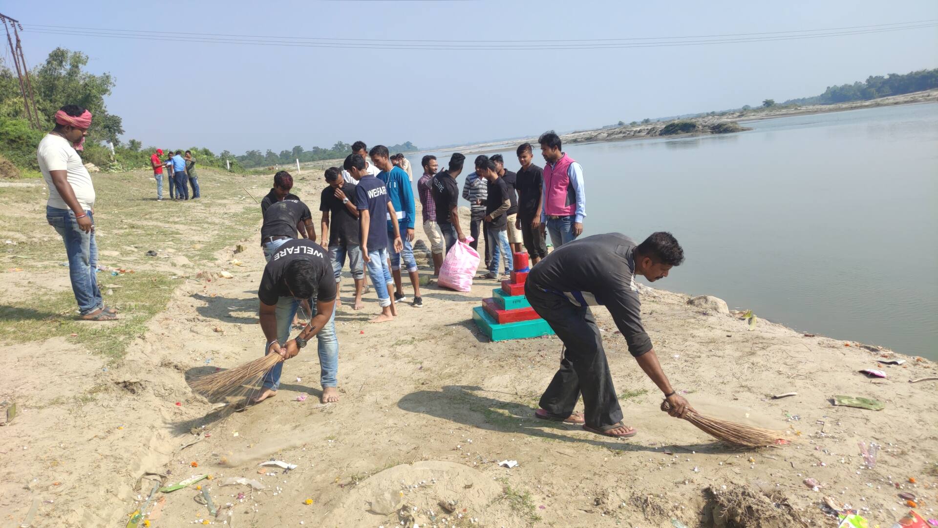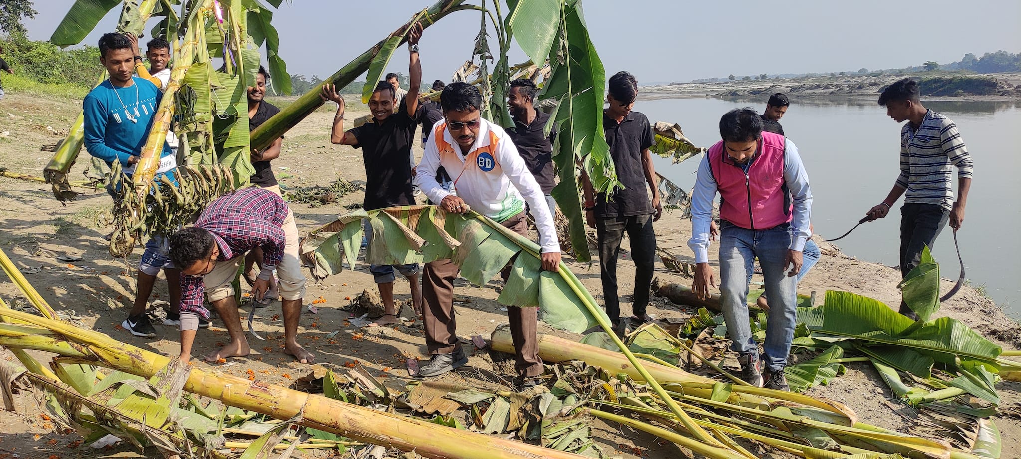 মৃণ্ময়ী প্রতিমা বিসর্জনের পর নদী বক্ষেই পড়ে ছিল কাঠামো। ছট পুজোর পরও নদী ঘিরে কলা গাছ থেকে শুরু করে পুজোয় ব্যবহৃত নানা উপকরণ ছড়িয়ে ছিটিয়ে ছিল এদিক ওদিক। নদীতে নেমে সেগুলি সংস্কারের উদ্যোগ নেন সংগঠনের সদস্যরা।