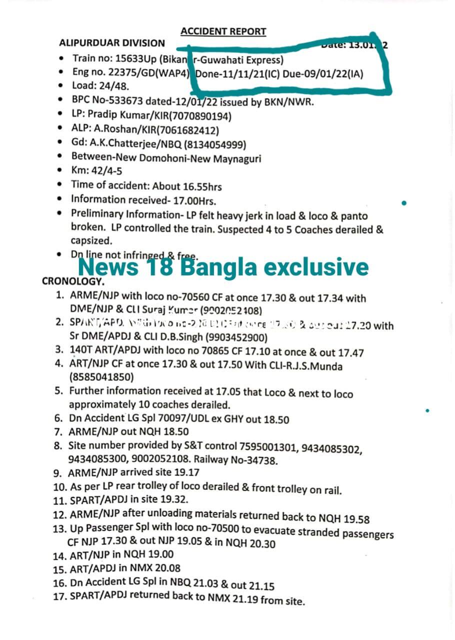 কী করে বোঝা যাবে ট্রেনের ইঞ্জিনের রক্ষণাবেক্ষণ সংক্রান্ত পরীক্ষা হয়নি? ১৩ তারিখের দুর্ঘটনা সংক্রান্ত একটি রিপোর্ট তৈরি করেছে আলিপুরদুয়ার ডিভিশন। সেই রিপোর্টের দ্বিতীয় পয়েন্টে উল্লেখ করা হয়েছে ইঞ্জিনের নম্বর (Bikaner-Guwahati Express Derailment Investigation)।