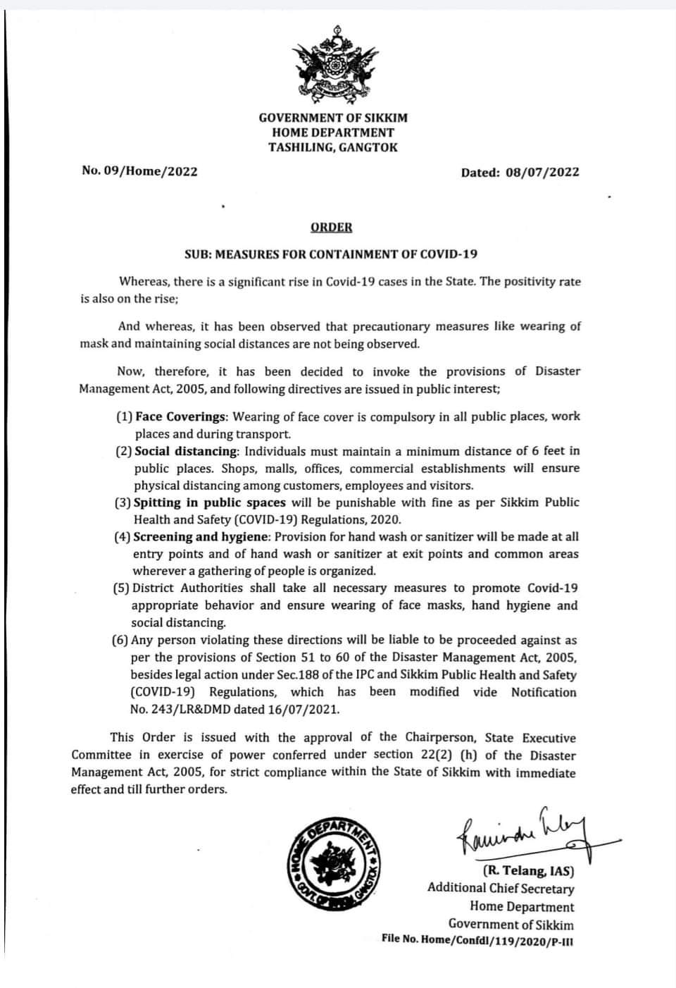 আজ এক নির্দেশিকা জারি করল সিকিম প্রশাসন। বাড়ি থেকে বের হলেই নাক-মুখ ঢাকতে হবে মাস্কে। ব্যবহার করতে হবে হ্যান্ড স্যানিটাইজার। ৬ ফুটের দূরত্ববিধিও মানতে হবে। আইন ভাঙলে কড়া ব্যবস্থা নেওয়া হবে বলেও নির্দেশিকায় উল্লেখ আছে। সিকিমে ঢোকার পয়েন্টগুলিতেও চেকিং করবে রাজ্য স্বাস্থ্য দফতরের কর্মীরা। গাড়িতে চাপলেও ব্যবহার করতে হবে মাস্ক।
