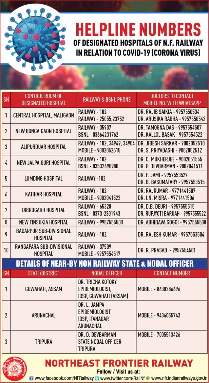 ট্রেনে সফরের সময়ে কোনো যাত্রী অসুস্থ বোধ করলে তৎক্ষনাৎ কর্তব্যরত টিটিই বা নিকটবর্তী স্টেশন মাস্টারের সঙ্গে সরাসরি যোগাযোগ করার পরামর্শ দেওয়া হয়েছে। রেল হাসপাতালের স্বাস্থ্য কর্মীদের হ্যাণ্ড স্যানিটাইজার বিলি করা হয়েছে। জেননা রুগীদের খুব কাছাকাছি থাকবেন স্বাস্থ্য কর্মীরা। তাই কোনও রকম ঝুঁকি নিতে চাইছে না রেল। আগেই বিভিন্ন রেল হাসপাতালে দু'জন করে চিকিৎসক নিয়োগ করেছিল উঃপূঃ সীমান্ত রেল। এবারে গুয়াহাটি, অরুনাচল এবং ত্রিপুরায় নোডাল অফিসার নিয়োগ করলো। ৩ জায়গার নোডাল অফিসারদের নম্বরও দেওয়া হয়েছে। গুয়াহাটির নোডাল অফিসারের ফোন নম্বর হল ৮৬৩৮২৮৬৬৯৬, অরুনাচলের ৯৪৩৬০৫৫৭৪৩ এবং ত্রিপুরার ৭০০৫৫১৩৪২৬।