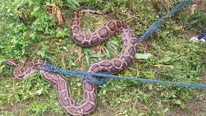 খাবারের লোভে জঙ্গল থেকে লোকালয়ে ঢুকে জালে আটকা পড়ল ১৩ ফুট লম্বা অজগর