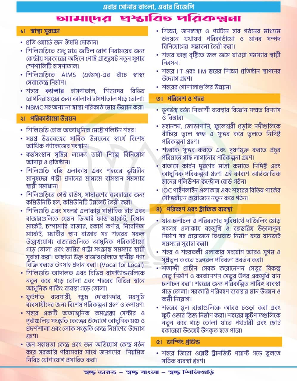 আজ জেলা কার্যালয়ে এর আনুষ্ঠানিক উদ্বোধন করেন কেন্দ্রীয় পর্যটনমন্ত্রী প্রহ্লাদ সিং প্যাটেল। সঙ্গে ছিলেন জেলা সভাপতি প্রভীন আগরওয়াল, প্রার্থী শঙ্কর ঘোষ। তিনি জানান, শহরের উন্নয়নের গতি বাড়াতেই এই সংকল্প পত্র। পরিকল্পনামাফিক উন্নয়নের লক্ষ্যেই ১০ দফা প্রস্তাব নেওয়া হয়েছে। জয়ী হয়ে এলে তা বাস্তবায়িত করা হবে। কি কি আছে বিজেপির এই সংকল্প পত্রে? শহরের প্রতিটি ওয়ার্ডে জন ওষুধ দোকান চালু করা থেকে জটিল রোগের চিকিৎসায় কেন্দ্রের আওতায় সুপার স্পেশালিটি হাসপাতাল তৈরি করা। পাশাপাশি এইমসের ধাঁচে স্বাস্থ্য পরিষেবা চালু করা। শহরের যানজট নিয়ন্ত্রণে সুনির্দিষ্ট প্রস্তাব নেওয়া হয়েছে। দার্জিলিং মোড়ে উড়ালপুল তৈরী থেকে শহরের রাস্তাগুলো আরো চওড়া করা। শহরকে দূষণমুক্ত রাখতে বুক চিড়ে যাওয়া মহানন্দা, ফুলেশ্বরী, জোড়াপানি সেতুর সংস্কার করার সঙ্গে সবুজ বাঁচাতে প্রচুর পরিমাণে গাছ লাগানো হবে। শহরে আন্তর্জাতিকমানের ক্রিকেট স্টেডিয়াম তৈরীর পাশাপাশি ইণ্ডোর স্টেডিয়ামের মানোন্নয়ন করা। বালক ও বালিকাদের জন্যে হস্টেল তৈরী করার পরিকল্পনা রয়েছে। বস্তি উন্নয়নেও কিছু প্রস্তাব নেওয়া হয়েছে। শহরে পানীয় জলের সমস্যা কাটাতে বিজেপির পরিকল্পনা "হর ঘর মে কল, হর কল মে পানি।" অর্থাৎ প্রতিটি ঘরেই পরিস্রুত পানীয় জল পৌঁছে দেওয়া।