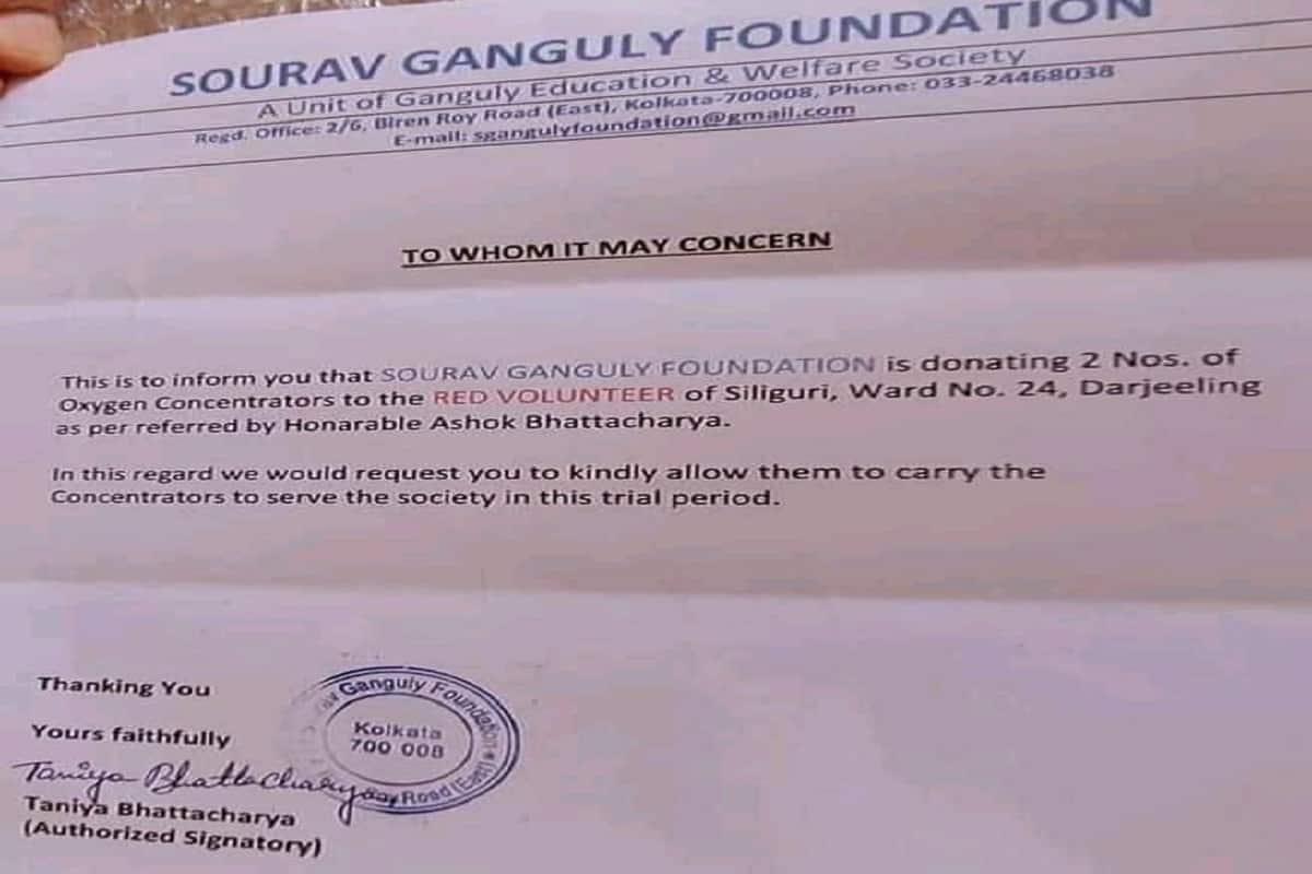 বেহালায় সৌরভের অফিস থেকে অক্সিজেন কনসেনট্রেটর সংগ্রহ করে শিলিগুড়ি নিয়ে যান। মূলত বাম নেতা অশোক ভট্টাচার্যের অনুরোধে এই সাহায্যের হাত বাড়িয়ে দেন সৌরভ। সোশ্যাল মিডিয়ায় রেড ভলেন্টিয়ারদের সৌরভের সাহায্য করার খবরটি অশোক ভট্টাচার্য ছবি-সহ পোস্ট করেন। রাজনীতিতে না থাকলেও সৌরভের সঙ্গে অশোক ভট্টাচার্যের সম্পর্ক দীর্ঘদিনের। দুই পরিবারের মধ্যে পারিবারিক সম্পর্ক রয়েছে। অশোক ভট্টাচার্যের অনুরোধ কখনই ফেলতে পারেন না সৌরভ। সবসময়ই সাহায্যের হাত বাড়িয়ে দেন মহারাজ।