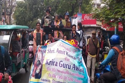 এদিন ক্রীড়াগুরু শহরে ফিরতেই চলল সংবর্ধনার পালা। টিটি অ্যাকাডেমির উদ্যোগে বরণ উৎসব। হুডখোলা জিপে বাঘাযতীন পার্ক থেকে শহর ঘুরিয়ে শেষ হল টিটি আকাদেমীতে। উত্তরবঙ্গ স্পোর্টস বোর্ডের নান্টু পাল জানান, দীর্ঘদিন বঞ্চিত ছিলেন। এই সম্মান শহরের টেবল টেনিসে নতুন অধ্যায়ের সূচনা করবে।