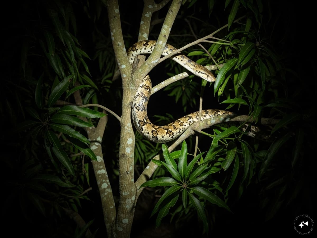 আমগাছের মাথায় কুণ্ডলী পাকিয়ে বসে রয়েছে বিশাল আকৃতির এক কিং কোবরা! প্রায় ১২ ফুট লম্বা সেই সাপের লকলকে শরীর ঝলসে উঠছে টর্চের আলোয়, আর গাছের ডালে ডালে তার ছায়া যেন একটা জীবন্ত দুঃস্বপ্নের মতো কাঁপছে।