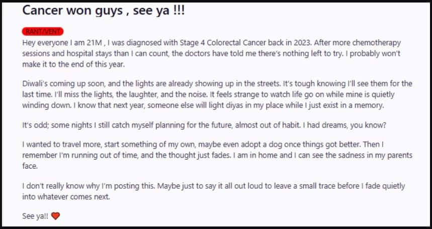 যুবক জানিয়েছেন যে, কয়েক মাস কেমোথেরাপি এবং হাসপাতালে থাকার পর, ডাক্তাররা সমস্ত চিকিৎসার বিকল্প শেষ করে ফেলেছেন, যার ফলে তাঁকে একটি ভয়াবহ পূর্বাভাস দেওয়া হয়েছে যে তিনি সম্ভবত এই বছরটিই বাঁচবেন না। দীপাবলি ঘনিয়ে আসার সঙ্গে সঙ্গে, তিনি তার শেষ আলোর উৎসবটি উপভোগ করার বেদনা প্রকাশ করেছেন।