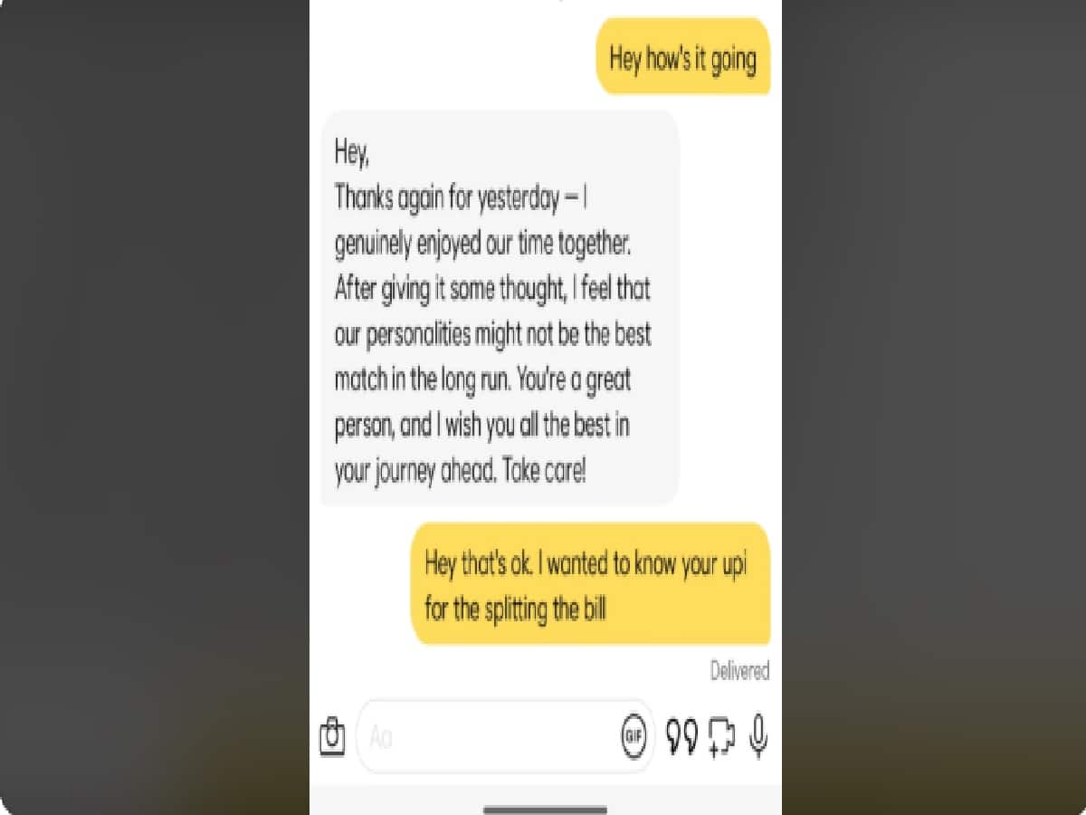 সম্প্রতি Reddit-এ “Well…” শিরোনামে এক পোস্টে তিনি শেয়ার করেন ডেটের পরের অভিজ্ঞতা। পোস্টের সঙ্গে দেওয়া স্ক্রিনশটে দেখা যায়, ডেটের পরের দিন তিনি ছেলেটিকে মেসেজ করেছিলেন—“How it’s going?” ছেলেটি বিনয়ের সঙ্গে রিপ্লাই দেয়, “Hey, thanks again for yesterday – I genuinely enjoyed our time together.” কিন্তু এরপর জানায় যে, সে মনে করে তাঁদের ব্যক্তিত্ব একে অপরের সঙ্গে তেমন মানাচ্ছে না।
