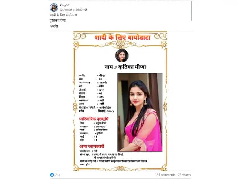 একটি ছবি পোস্ট করা হয়েছে ফেসবুক পেজ খুশি থেকে। যা ভাইরাল হয়ে গিয়েছে। আর ছড়িয়ে পড়া ছবিটি আসলে একটি বায়োডেটার ছবি। আর কৃতিকা মীনা নামে একটি মেয়ের বায়োডেটা। তা থেকে জানা যাচ্ছে যে, কৃতিকার জন্মস্থান হল অজমের। তাঁর বয়স ২৬ বছর। কৃতিকার বাবা রাহুল মীনা একজন দোকানদার। এমএ পর্যন্ত পড়াশোনা করেছেন তিনি। আর সেলাই এবং নাচ করতে ভালবাসেন। তবে কোনও চাকরি করেন না ওই যুবতী।