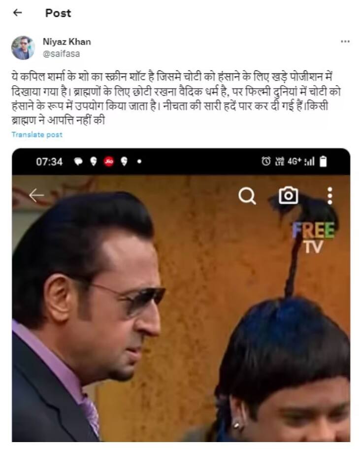 লিখেছেন যে, “এটা কপিল শর্মার শোয়ের স্ক্রিনশট। এখানে মাথার উপর উঁচিয়ে থাকা বিনুনিকে লোক হাসানোর জন্য ব্যবহার করা হয়েছে। অথচ ব্রাহ্মণদের জন্য এই বিনুনি রাখা বৈদিক ধর্মের অঙ্গ। কিন্তু ফিল্মি দুনিয়ায় বিনুনিকে লোক হাসানোর উপকরণ হিসেবে ব্যবহার করা হচ্ছে। নিচতার সমস্ত সীমা অতিক্রম করে গিয়েছে। অথচ কোনও ব্রাহ্মণ আপত্তিও জানাননি।”