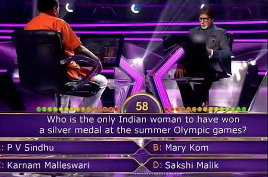 এ বার এই জনপ্রিয় গেম শোয়ের ১২ নম্বর সিজন চলছে। আর এই সিজনের একটি এপিসোডে মধ্যপ্রদেশের এক প্রতিযোগী কোশলেন্দ্র সিং তোমর অলিম্পিক নিয়ে এক প্রশ্নে বিপাকে পড়ে যান। হটসিটে বসা কোশলেন্দ্র সিং তোমর তাঁর ষষ্ঠ প্রশ্ন অর্থাৎ ২০,০০০ টাকার প্রশ্ন পর্যন্ত মাত্র একটি লাইফলাইন নিয়েছিলেন। কিন্তু শিয়রে বিপদ ঘনায়, যখন সপ্তম প্রশ্ন হাজির হয়। সাত নম্বর প্রশ্নটি ছিল ৪০,০০০ টাকার জন্য। তোমরকে প্রশ্ন করা হয়, সামার অলিম্পিক গেমসে একমাত্র কোন ভারতীয় মহিলা রুপো জেতেন? এই প্রশ্নের জন্য অপশনগুলি ছিল- পি ভি সিন্ধু, মেরি কম, কর্ণম মালেশ্বরী আর সাক্ষী মালিক।