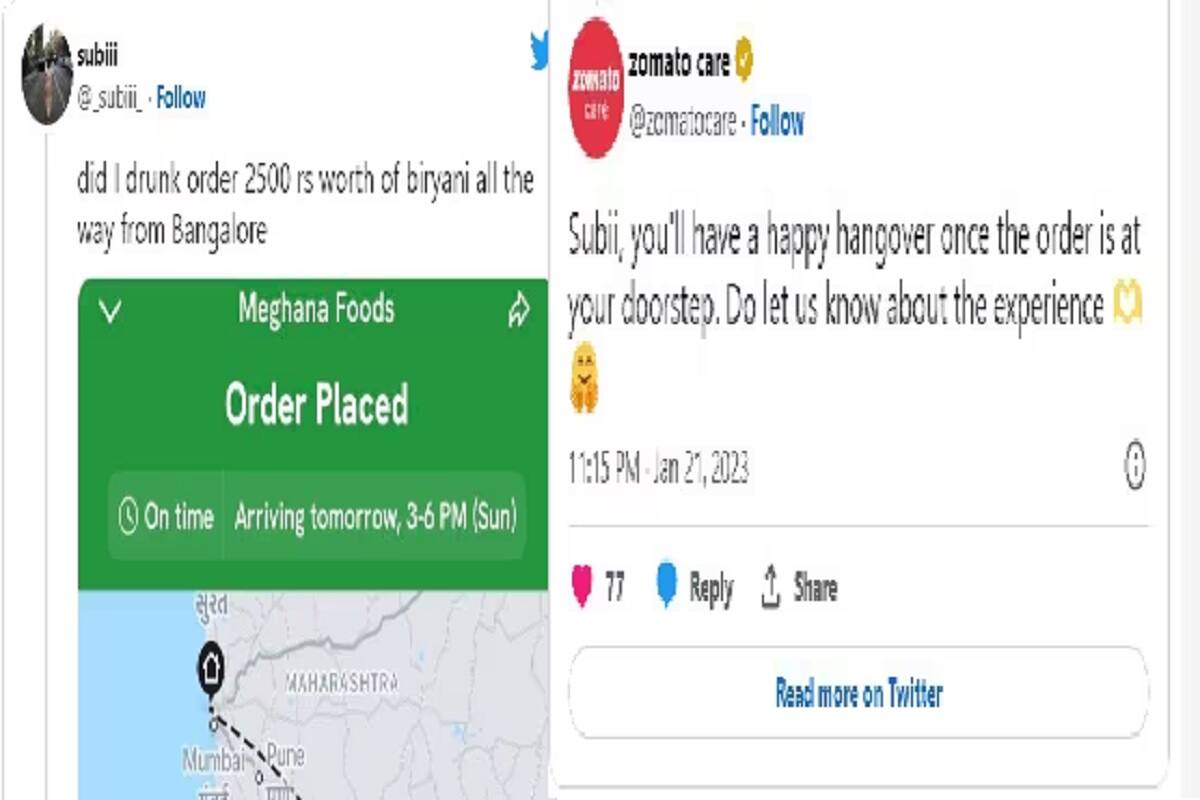 Zomato Intercity 'Zomato Legend'-এ খাবারের অর্ডার দিয়ে দেন তিনি। মেয়েটির অর্ডারের পরিপ্রেক্ষিতে অর্ডারটি গ্রহণও করে Zomato যাতে পরের দিনে অর্ডারটি পৌঁছে যাবে বলে জানানো হয়। শুধু তাই নয় Zomato-র তরফ থেকে বলা হয়, "সুবি এই অর্ডার তোমার দরজার সামনে পৌঁছালে তোমার হ্যাঙ্গওভার অত্যন্ত ভালভাবে কাটবে, আমাদের নিজের অভিজ্ঞতার কথা জানিও কিন্তু" Zomato-এই উত্তরের স্ক্রিনশটও নিজের ট্যুইটার হ্যান্ডেল থেকে শেয়ার করেছেন এই সুবি নামের মহিলাটি।