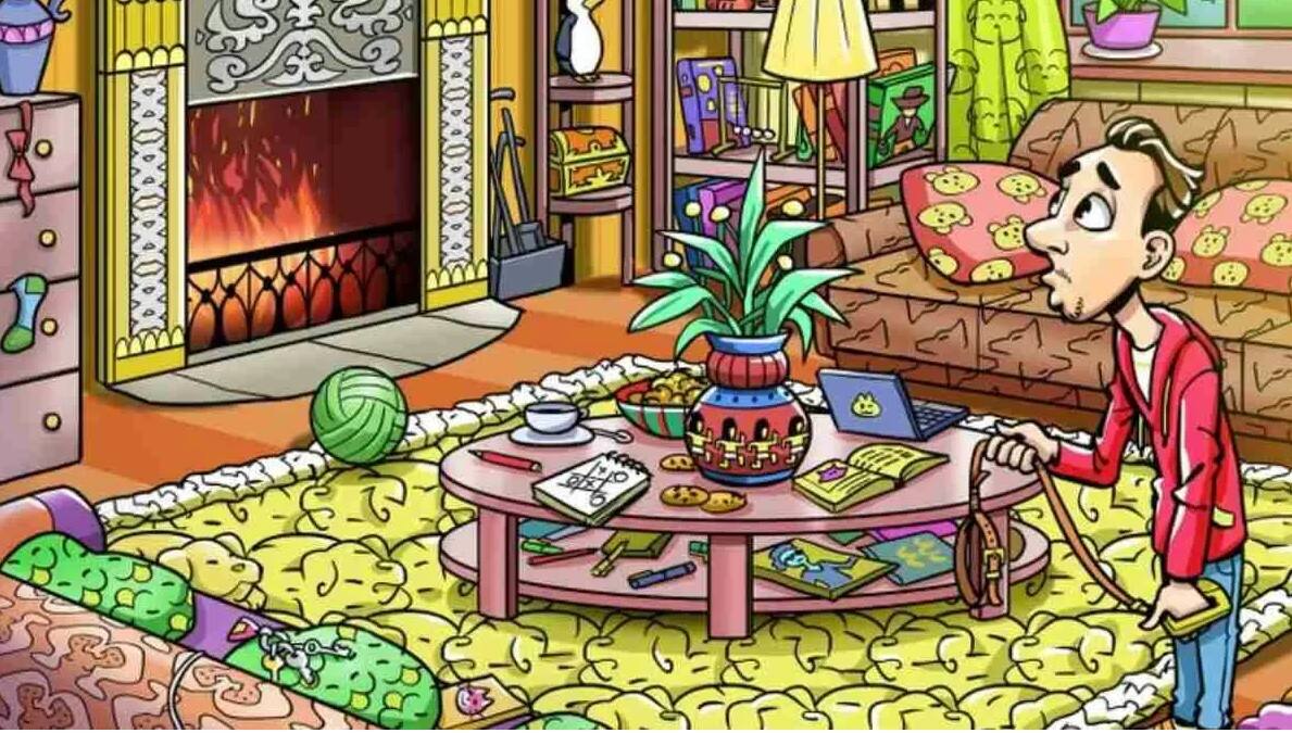 সেটাই তো হল প্রশ্ন! এই অপটিক্যাল ইলিউশনে দেখা যাচ্ছে সুন্দর এক বসার ঘর, পশ্চিমি কোনও শহরের। সেখানে সুন্দর করে সাজানো আছে সেন্টার টেবিল, তাকে ঘিরে মুখোমুখি দুই সোফা, একদিকে ড্রয়ার, ফায়ার প্লেস, তার পাশে একটা তাক, সেখানে কত কী না সাজিয়ে রাখা। মেঝে জুড়ে বিছিয়ে আছে নরম হলুদ রঙের গালচে। আর এত কিছুর মধ্যে কলার হাতে নিয়ে দাঁড়িয়ে পুরোপুরি হতভম্ব এক ভদ্রলোক- পোষ্য তাহলে গেল কোথায়?