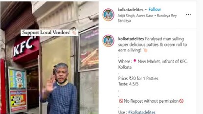 ইন্সটাগ্রাম ব্লগার Kolkatadelites সম্প্রতি একটি ভিডিও পোস্ট করেছে। ভিডিওতে দেখা গিয়েছে একজন পক্ষাঘাতগ্রস্ত (New Market Paralysed Patties Seller) ব্যক্তি একটি ঠেলার সামনে দাঁড়িয়ে রয়েছেন৷ প্যাটিস এবং ক্রিম রোল বিক্রি করছেন তিনি। Kolkatadelites জানিয়েছে, এই ব্যক্তি বিগত ৩৫ বছর ধরে প্যাটিস বিক্রি করে চলেছেন। নিরামিষ এবং আমিষ দুই ধরনের প্যাটিই বিক্রি করেন তিনি। একজন নিরাপত্তারক্ষীও রয়েছেন, যিনি বিক্রেতার পাশে দাঁড়িয়ে খদ্দেরদের খাবার এগিয়ে দিতে সাহায্য করেন। প্রতিটি প্যাটির দাম মাত্র ২০ টাকা। নিউ মার্কেটে কেএফসির সামনে গেলেই দেখা মিলবে তাঁর।