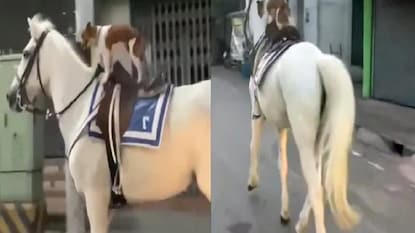 ট্যুইটারে (Twitter) শেয়ার করা ছোট ক্লিপটিতে দেখা যাচ্ছে, সাদা রঙের একটি ঘোড়া রাস্তায় দৌড়চ্ছে। তার পিঠে চড়ে রয়েছে একটি কুকুর। যেখানে কোনও মানুষ বসে থাকার কথা, ঘোড়ার পিঠের সেই জায়গায় কুকুরটি দাঁড়িয়ে রয়েছে। ঘোড়ার পিঠে চড়ে সে তো খুশিতে ডগমগ। ঘোড়াটি সারা শহর জুড়ে ঘুরে বেড়াচ্ছে, কুকুরটিও তার পিঠে চড়ে তার সহযাত্রীর ভূমিকায় রয়েছে। যেন মনে হচ্ছে ঘোড়ার লাগাম রয়েছে কুকুরের কাছে। একটি ট্রাফিক সিগন্যালেও ঘোড়াটিকে একবার থামতে দেখা গিয়েছে ভিডিওতে।