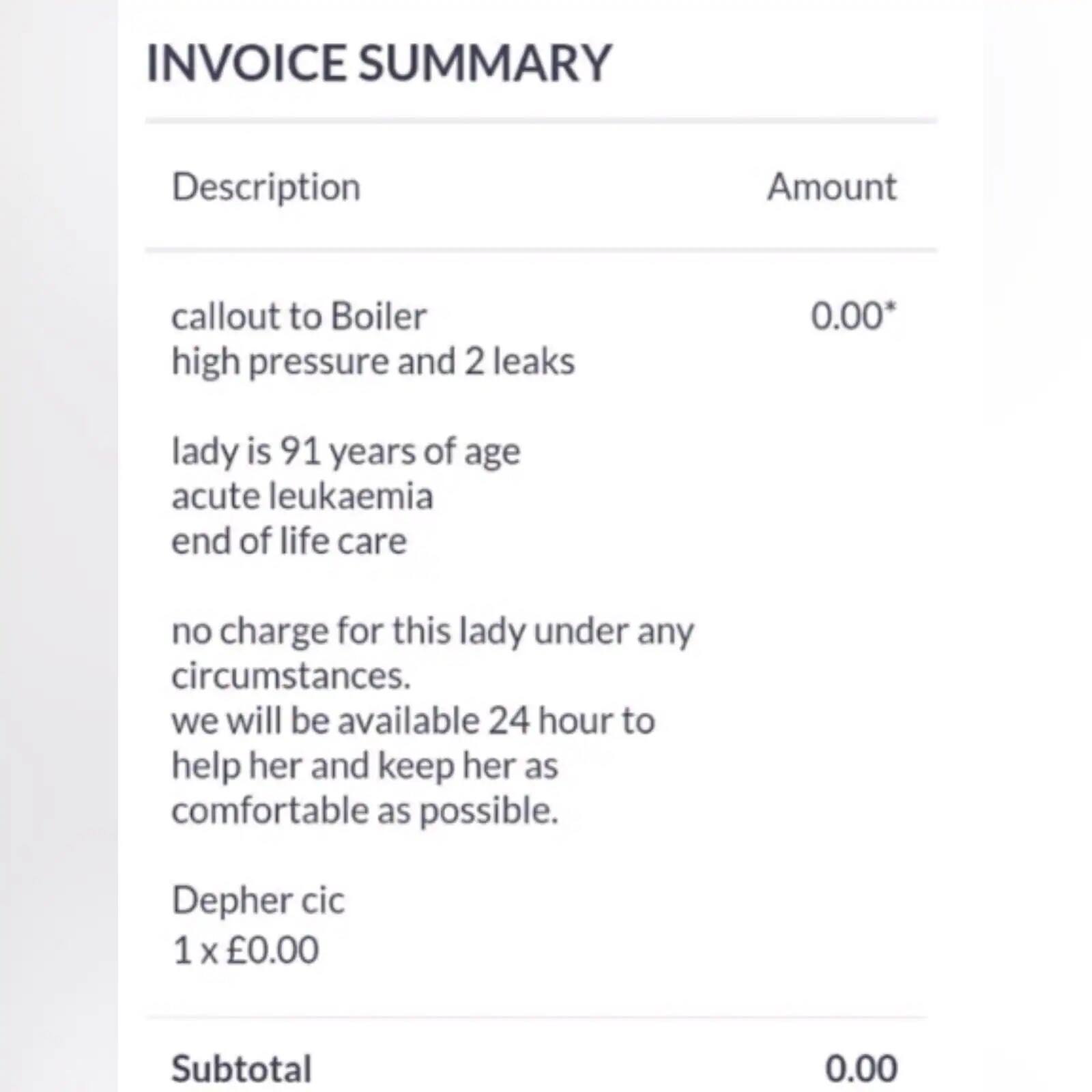 আসলে অ্যান্ডারসন ৯১ বছরের একজন বয়স্ক মহিলার বাড়িতে প্লাম্বিংয়ের কাজে যোগ দিয়েছিলেন (Worked as plumbing in elderly woman’s house)। ওই বৃদ্ধ মহিলা বর্তমানে গুরুতর লিউকেমিয়ায় (Leukemia) ভুগছেন। কাজ করার পরে অ্যান্ডারসন তাঁর হাতে যে বিল ধরিয়ে দিয়েছিলেন তাতে তিনি শূন্য পরিমাণ অর্থ দাবি করেছিলেন। এই গল্পই যখন তিনি ইন্টারনেটে শেয়ার করেন তখন নেটাগরিকরা তাঁর প্রশংসা করেছেন।