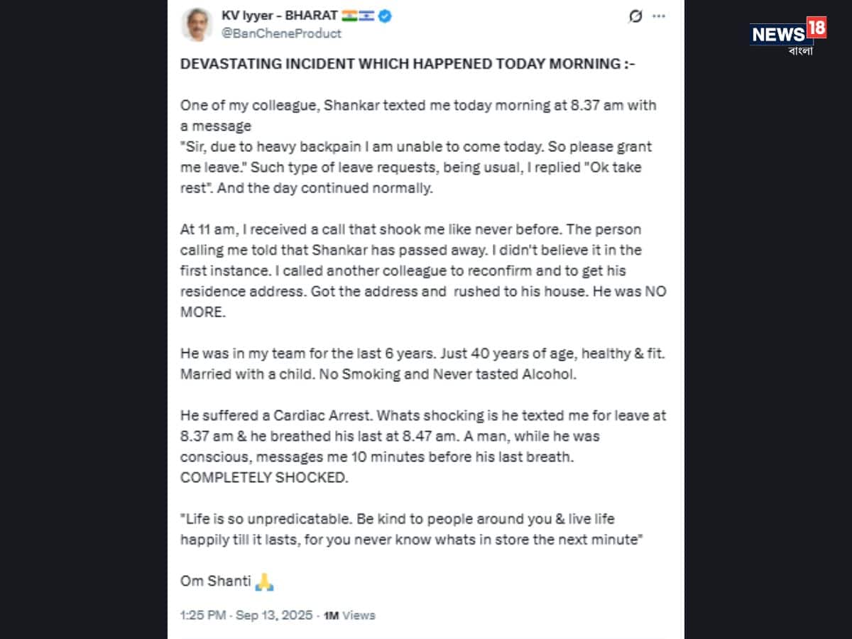 কেভি আইয়ার এই বিধ্বংসী ঘটনাটি এখন-ভাইরাল পোস্টে X-এ শেয়ার করেছেন। “আমার একজন সহকর্মী, শঙ্কর, আমাকে সকাল ৮:৩৭ টায় টেক্সট করেছিলেন, ‘স্যার, তীব্র পিঠের ব্যথার কারণে আমি আজ আসতে পারছি না। অনুগ্রহ করে আমাকে ছুটি দিন।’ এমন বার্তা রুটিন, তাই আমি উত্তর দিয়েছিলাম, ‘ঠিক আছে, বিশ্রাম নাও।’ দিনটি স্বাভাবিকভাবে চলছিল,” তিনি লিখেছেন।