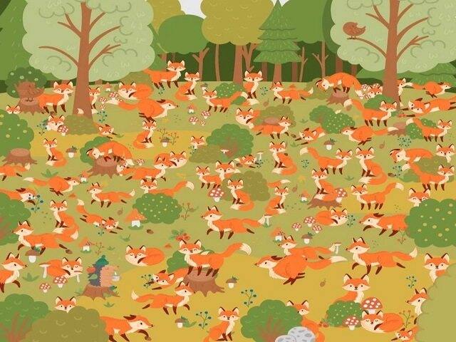 একটি নীল চোখের শিয়াল অন্য একটি শিয়াল বন্ধুর সঙ্গে বসে আছে যা দেখে গাছের গোড়া বলে মনে হচ্ছে। এই অপটিক্যাল ইলিউশনটি কঠিন, কারণ চোখ দিয়ে খুঁজতে গিয়ে সর্বত্র নীল চোখই দেখতে থাকেন মানুষ।