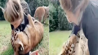 ভিডিওতে দেখা গিয়েছে, এক সঙ্গে ৩-৪টে বাঘের সঙ্গে খেলা করছে এক মহিলা। আরও আশ্চর্যের এক ব্যপার হল, তারই মধ্যে একটি বাঘকে একেবারে জড়িয়ে ধরে আদর করছে মহিলাটি। শুধুতাই নয়, বাঘের ঠোঁটে চুমুও দিচ্ছে সে। মহিলাটি বাঘটিকে ছাড়তে গেলেও কিছুতেই তাকে ছাড়তে চাইছে না বাঘ।বাঘের আদরের ঠেলায় রীতিমত কাহিল হয়ে পড়ে সেই মহিলা।