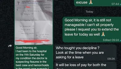 ওই কর্মী লিখেছিলেন, “আমি দীর্ঘক্ষণ বসতে বা দাঁড়াতে পারছি না… দয়া করে আজকের জন্য আমাকে মেডিক্যাল লিভ দিন।” কোনও সাড়া না পেয়ে তিনি পরে বলেছিলেন যে তাঁর অবস্থা এখনও ভাল নয়। কিন্তু ছুটি পাওয়ার পরিবর্তে সেই কর্মীকে তিরস্কার করা হয়েছিল। এর পর সেই কর্মীর উপরে সন্দেহ প্রকাশ করে ম্যানেজার জানান, “আপনি যখন ছুটি চাইছেন তখন দুই দিনের বেতন কাটা যাবে।”