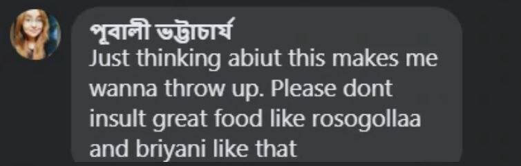 কিন্তু এই মানুষরাই নতুন ফিউশন ফুড ‘রসগোল্লা বিরিয়ানি’ শুনেই বেজায় চটেছেন৷ একটি ফেসবুক পেজ যার নাম ম্যাডলি ফু়ড লাভার (Madly Food Lover) সকলের কার্যত ‘বোলতি বন্ধ’ করে দিয়েছেন৷ সেখানে একটি ভিডিও পোস্ট হয়েছে যেখানে দেখা যাচ্ছে দম বিরিয়ানির হাঁড়ির ভিতর থেকে রস টইটুম্বর রসগোল্লা বেরোচ্ছে! যিনি এই প্রোফাইলের ব্লগার তিনি পরিষ্কার ক্যামেরায় দেখাচ্ছেন কীভাবে বিরিয়ানির ভিতর থেকে রসগোল্লা বার হল!