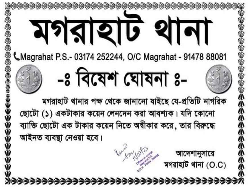 মগরাহাট: এবার ছোট এক টাকার কয়েন না নিলেই পড়বেন বিপদে। ছোট ১ টাকার কয়েন না নিলেই আপনার বিরুদ্ধে নেওয়া হতে পারে আইনানুগ ব্যবস্থা। সম্প্রতি নেট দুনিয়ায় ভাইরাল হয়েছে এমন একটি পোস্ট। মগরাহাট থানার পক্ষ থেকে এ নিয়ে প্রচারের একটি পোস্ট ভাইরাল হয়ে যায়। কি ছিল সেই পোস্টে, পোস্টে লেখা ছিল ছোট ১ টাকার কয়েনে লেনদেন করা আবশ্যক। যদি কোনও ব্যক্তি টাকা নিতে অস্বীকার করে তার বিরুদ্ধে আইনত ব্যবস্থা নেওয়া হবে। এ নিয়ে মগরাহাট থানায় যোগাযোগ করা হলে তাঁরাও এই একই কথা জানান।