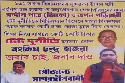 দক্ষিণ ২৪ পরগনার বিভিন্ন এলাকায় শাসক দলের নেতৃত্বের বিরুদ্ধে বেশ কিছুদিন ধরেই দুর্নীতির অভিযোগে পোস্টার পড়া শুরু হয়েছে। এই পোস্টারগুলোয় মূলত চাকরি বিক্রির অভিযোগ আনা হচ্ছে। গঙ্গাসাগরেও যে রঙিন পোস্টার পড়েছে সেখানেও ওই একই অভিযোগ আনা হয়েছে। দক্ষিণ ২৪ পরগনা জেলা পরিষদের দুই তৃণমূল সদস্য সন্দীপ পাত্র (জিকো) ও তপন পাড়িয়ারী বিরুদ্ধেই মূলত এই দুর্নীতির অভিযোগ আনা হয়েছে। এই দুই জেলা পরিষদ সদস্য টেট দুর্নীতির মিডিলম্যান হিসেবে সাগর থেকে কয়েক কোটি টাকা তুলে নিয়ে বেপাত্তা হয়ে গিয়েছেন বলে অভিযোগ করা হয়েছে ওই পোস্টারে। আর এই গোটা কাজে অনুপ্রেরণা দিয়েছেন স্থানীয় বিধায়ক তথা মন্ত্রী বঙ্কিমচন্দ্র হাজরা, এমনটাই দাবি করা হয়েছে ওই পোস্টারে।