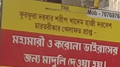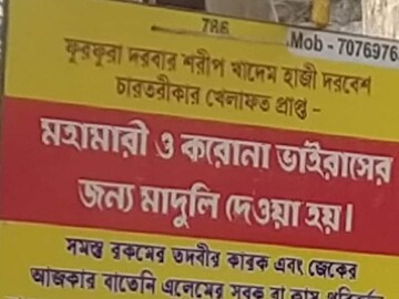 'গলায় মাদুলি ঝোলান, আর করোনা থেকে সেরে উঠুন।' এটাই স্লোগান। আর এই স্লোগানকেই সাইন বোর্ডে লিখে প্রকাশ্যে টাঙিয়েও দিয়েছেন হলদিয়ার সুতাহাটার সৈয়দ আবদুল কাদের নামে এক ব্যক্তি। যিনি দাবি করছেন- বাড়ির ভেতরে একটা মাদুলি ঝুলিয়ে রাখার সঙ্গে সঙ্গে গলাতেও একটা মাদুলি পরতে হবে। তা হলেই করোনাভাইরাস দূরে চলে যাবে!