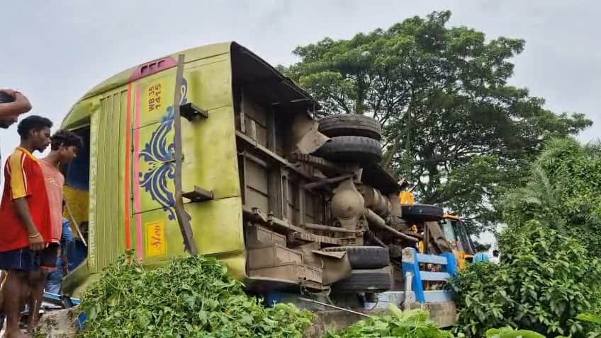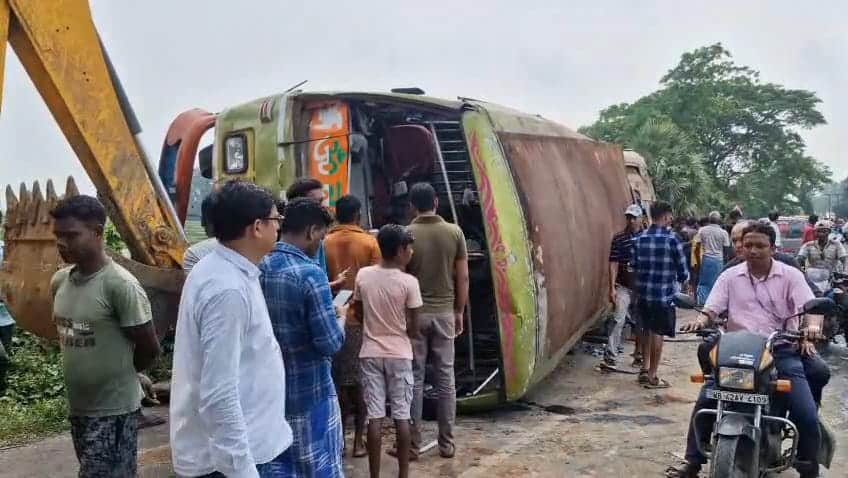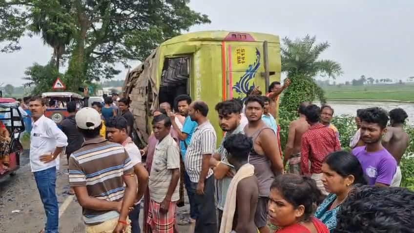 Accident: বাসটি বর্ধমান-নবদ্বীপ রোড ধরে যাওয়ার সময় ভাণ্ডারডিহির কাছে নিয়ন্ত্রণ হারিয়ে প্রথমে একটি ইলেকট্রিক পোলে ধাক্কা মেরে রাস্তার ধারে কার্লভাটে ধাক্কা মেরে উল্টে যায়।