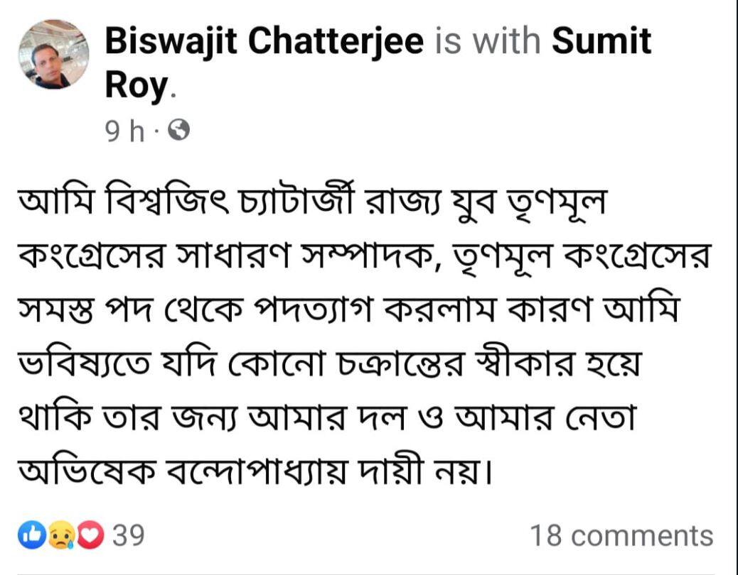 মঙ্গলবার রাতে করা ফেসবুক পোস্টে বিশ্বজিৎ চট্টোপাধ্যায় লিখেছেন, 'আমি বিশ্বজিৎ চট্টোপাধ্যায় রাজ্য যুব তৃণমূল কংগ্রেসের সাধারণ সম্পাদক, তৃণমূল কংগ্রেসের সমস্ত পদ থেকে পদত্যাগ করলাম কারণ আমি ভবিষ্যতে যদি কোনও চক্রান্তের স্বীকার হয়ে থাকি তার জন্য আমার দল ও আমার নেতা অভিষেক বন্দোপাধ্যায় দায়ী নয়।'