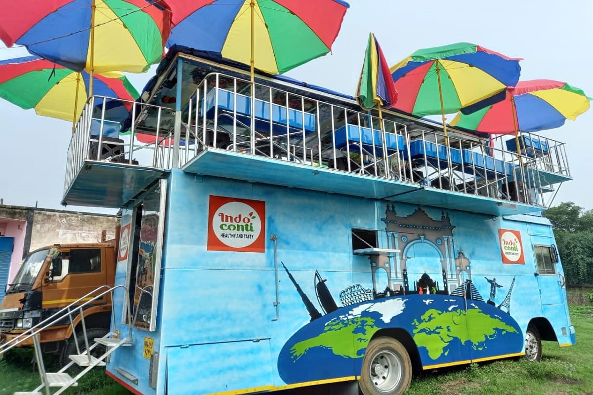 বিয়ের প্রীতি ভোজের জন্য অনুষ্ঠান বাড়ি মিলছে না ? কিংবা নিউ নরমাল পরিস্থিতিতে ৫০ জনের অধিক নিমন্ত্রিত করা যাবে না তাই কম বাজেটের অনুষ্ঠান বাড়ি প্রয়োজন? সে সব জায়গায় পৌঁছে যাবে পার্থ মন্ডলের এই ভাম্যমান রেস্টুরেন্ট। ঢোকার মুখেই হাত ধোয়ার বেসিন। সিঁড়ি দিয়ে ওপরে উঠলেই বসে খাওয়ার ব্যবস্থা রয়েছে রেস্টুরেন্টে। নিচের তলায় রয়েছে লিফট। তার মাধ্যমেই খাবার পৌঁছে যাবে ওপরতলায়। সেখানে টেবিল-চেয়ার ছাড়াও আইসক্রিম পার্লার থেকে শুরু করে সফট ড্রিংস তৈরি - সব ব্যবস্থাই রয়েছে।