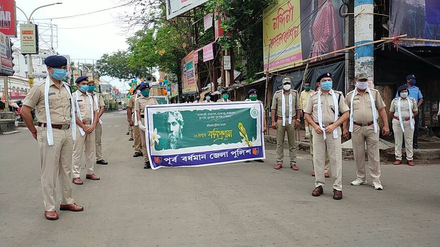 #বর্ধমান: মুখে মাস্ক বাঁধা। গলায় সাদা উত্তরীয়। তবে সকলের পরনে খাঁকি পোশাক। সামাজিক দূরত্ব বজায় রেখে প্রভাতফেরির মাধ্যমে কবি প্রনামের আয়োজন করল পূর্ব বর্ধমান জেলা পুলিশ। রবীন্দ্র সঙ্গীতের আবহে চলল করোনা সচেতনতা। এই উপলক্ষে দুটি ট্যাবলো বর্ধমান শহর পরিক্রমা করে। বর্ধমানের প্রাণকেন্দ্র কার্জনগেটে সবুজ পতাকা নেড়ে ট্যাবলোর সূচনা করেন জেলা পুলিশ সুপার ভাস্কর মুখোপাধ্যায়। তিনি বলেন, মূলত করোনা সংক্রমণ বিষয়ে শহরের বাসিন্দাদের সচেতন করতে এই কর্মসূচি। সেই সঙ্গে আজ জন্মদিনে কবিগুরুকে সম্মান জানানো হল।