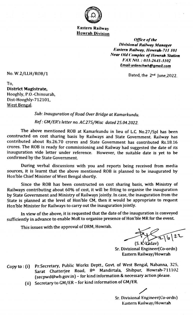 তবে উদ্বোধনের আগেই সেতু নিয়ে শুরু হল বিতর্ক। রেলের বক্তব্য, আগামিকাল চালু হবে কামারকুন্ডু রেল ওভার ব্রিজ। ব্রিজ উদ্বোধনে ডাক পায়নি রেল। রেলের দাবি, তারা রাজ্যের থেকে বেশি অর্থ বরাদ্দ করেছে। দু'বার রেলের তরফে জেনারেল ম্যানেজার ও ডি আর এম চিঠি দিয়েছিলেন মুখ্য সচিবকে রেল ওভার ব্রিজ উদ্বোধন চেয়ে। যদিও রাজ্য তাদের কয়েকদিন পরে করবে জানায়। আজ, বৃহস্পতিবার রেল সংবাদমাধ্যম থেকে জানতে পেরেছে ব্রিজ উদ্বোধন হবে। সেখানে আমন্ত্রণ পায়নি বলে অভিযোগ রেলের। পূর্ব রেলের মুখ্য জনসংযোগ আধিকারিক একলব্য চক্রবর্তী জানিয়েছেন, '' আজকেও রেলের তরফে জেলাশাসককে চিঠি পাঠানো হয়েছে। সেখানে বলা হয়েছে, আমরা সংবাদমাধ্যম থেকে জানতে পেরেছি আগামিকাল ব্রিজ উদ্বোধন হবে। মাননীয়া মুখ্যমন্ত্রী করবেন। যেহেতু আমাদের শেয়ারে ও সহযোগিতায় এই ব্রিজ করা হয়েছে, তাই আমারাও এই সেতু উদ্বোধনে থাকতে চাই।''