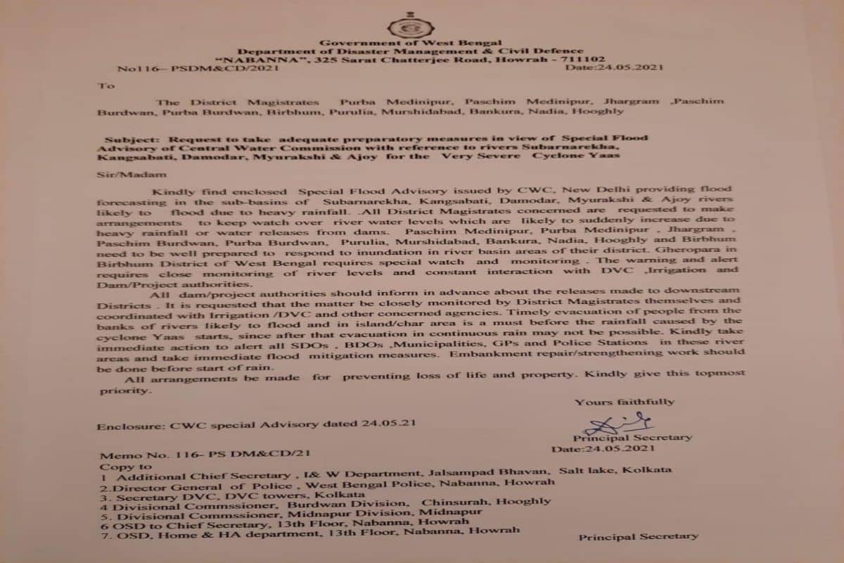 ঝড়ের তাণ্ডবে বিপর্যস্ত করতে না পারলেও ভয়াবহ বন্যা পরিস্থিতির (Flood Situation) সৃষ্টি করতে পারে ঘূর্ণিঝড় ইয়াস (Cyclone Yaas)। সেইমত আগাম প্রস্তুতি নিয়ে জেলা গুলিকে বন্যার জন্য বিশেষভাবে সতর্ক থাকতে বলল রাজ্য সরকার (West Bengal Govt)।