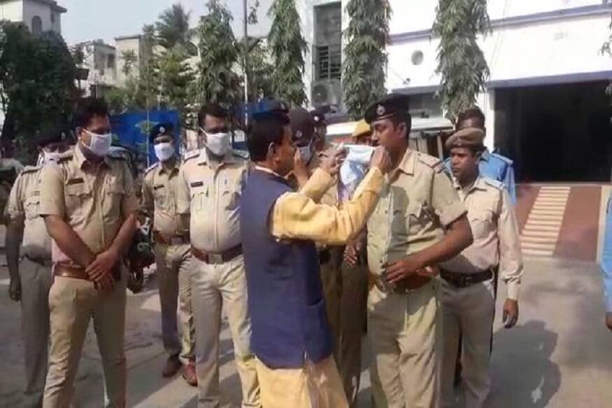করোনা সতর্কতায় পুলিশের মুখে মাস্ক বেঁধে দিলেন কোন মন্ত্রী!