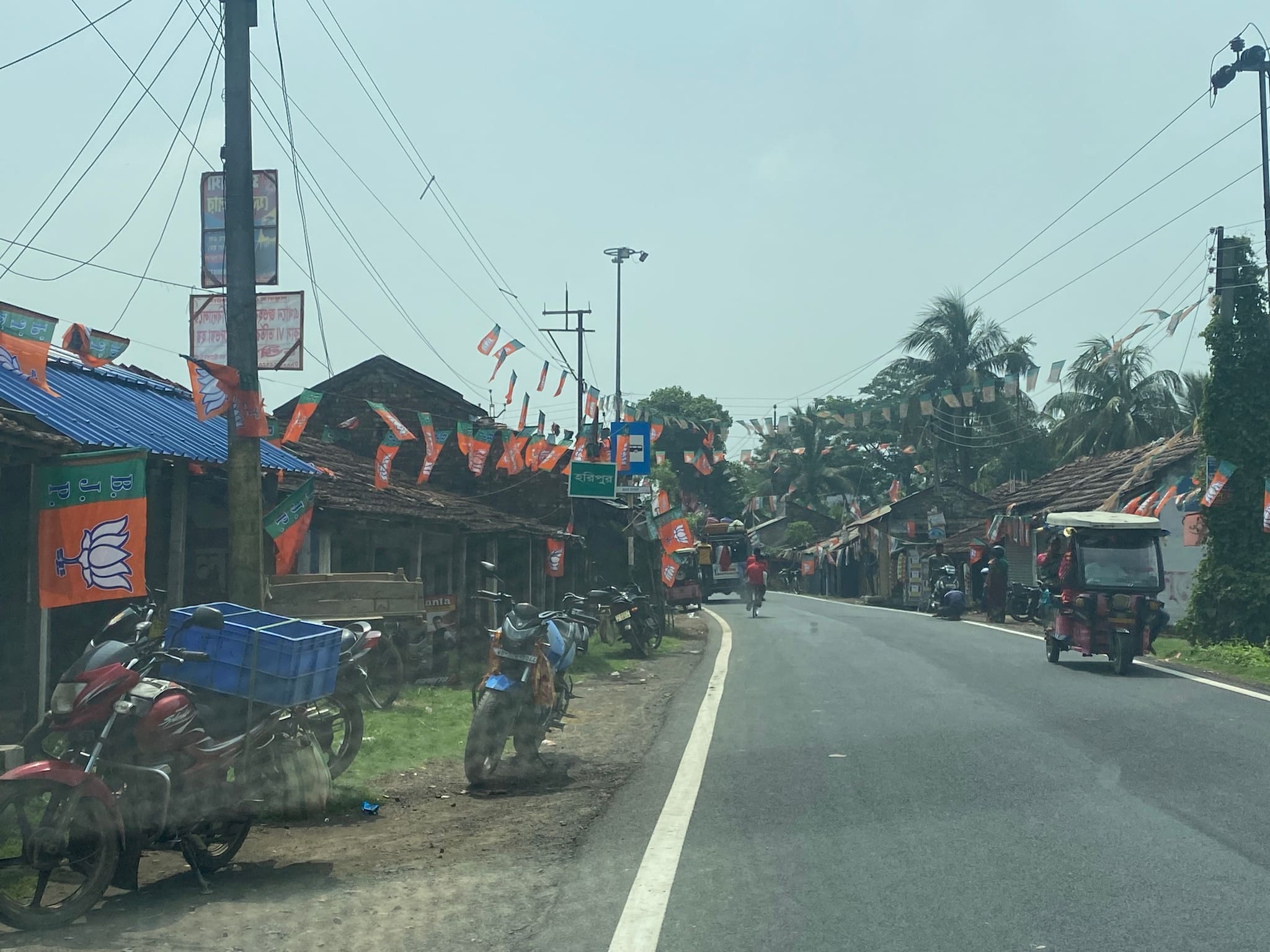 নন্দীগ্রামে পা ফেলে হাজির হওয়া যাক রায়পাড়া বাজারে, সেখান থেকে নন্দীগ্রাম বাজার পর্যন্ত আপাতত পায়চারির পরিসর। এই পথ এখনও পতাকায় ঢাকা; পথের এ-প্রান্ত থেকে সে-প্রান্ত ঢেকে আছে গেরুয়া আর সবুজ পতাকায়, কোথাও শতদল-বিলাস, কোথাও বা আবার ঘাসের ফুলের উচ্ছ্বাস- তৃণমূল কংগ্রেস হোক বা ভারতীয় জনতা পার্টি- কেউই নন্দীগ্রাম নিয়ে আপোস রফায় রাজি নয়, লড়াই এখনও চলছে।