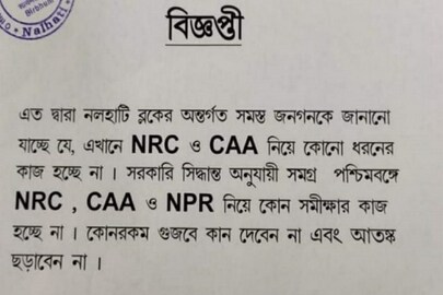 #নলহাটি: শেষমেষ BDO কে নোটিশ দিয়ে জানাতে হল CAA বা NRC সংক্রান্ত কোনও কাজ চলছে না তাঁর ব্লকের কোনও এলাকাতেই। তাই অযথা গুজবে কান দেবেন না বা আতঙ্কিত হবেন না। বীরভূমের নলহাটি ১ নম্বর ব্লকের BDO জগদীশ বাড়ুইকে এই নোটিশ জারি করতে হল ৷ কারণ গতকাল গ্রামে গিয়ে সাধারণ গ্রামবাসীদের বিক্ষোভের মধ্যে পড়তে হয়েছিল তাঁকে।