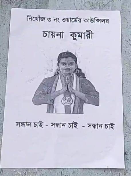 #বর্ধমান: শত্রুঘ্ন সিনহা,অগ্নিমিত্রা পল,কাঞ্চন মল্লিকের পর এবার বর্ধমান পৌরসভার ৩ নং ওয়ার্ডের কাউন্সিলার চায়না কুমারীর নামে নিখোঁজ পোস্টার। সন্ধান চাই এই মর্মে পোস্টার ৩ নং ওয়ার্ডের রসিকপুর এলাকায়। ঘটনাকে কেন্দ্র করে চাঞ্চল্য ছড়িয়েছে শহর জুড়ে। শুরু হয়েছে রাজনৈতিক চাপানউতোর।