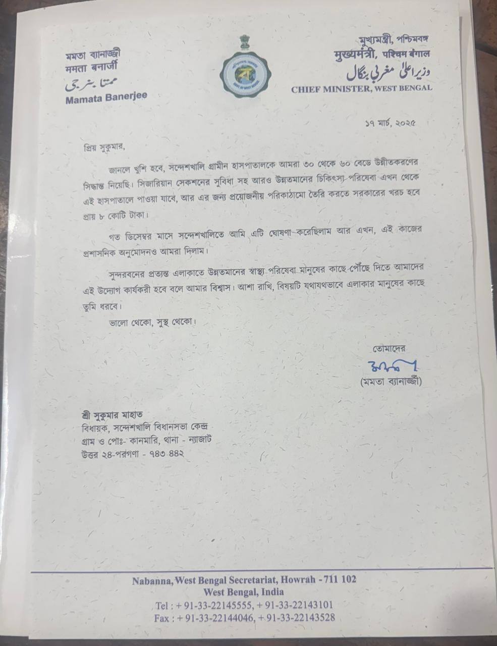 সন্দেশখালির বিধায়ক সুকুমার মাহাতকে চিঠি দিয়েছেন মুখ্যমন্ত্রী। সেখানে এই বিষয়টি উল্লেখ করেছেন। পাশাপাশি স্থানীয় তৃণমূল নেতৃত্বকে, হাসপতালের উন্নতির জন্য সরকারের এই বরাদ্দ কথা তুলে ধরে মানুষের কাছে প্রচার করার নির্দেশ দেওয়া হয়েছে সর্বোচ্চ স্তর থেকে। মুখ্যমন্ত্রী প্রতিশ্রুতি রক্ষা করায় খুশি ব্লক স্বাস্থ্য আধিকারিক থেকে সাধারণ মানুষ। এই প্রসঙ্গে বিধায়ক সুকুমার মাহাতো বলেন, ‘‘মুখ্যমন্ত্রী প্রতিশ্রুতি দিলে তিনি যে তা রাখেন তা আবারও প্রমাণিত হল। সন্দেশখালি, হিঙ্গলগঞ্জ-সহ সুন্দরবনের একটি বড় অংশের মানুষ এই গ্রামীন হাসপাতাল থেকে উন্নত স্বাস্থ্য পরিষেবার পাবেন। মুখ্যমন্ত্রী রাজ্যবাসীকে উন্নত স্বাস্থ্য পরিষেবার দিচ্ছেন। এবার সেই তালিকায় সন্দেশখালির নামও জুড়ে গেল।’’