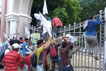 বিশ্ববিদ্যালয়ের পক্ষ থেকে তালা খুলতে কেউ এগিয়ে আসেনি। এর পর এসএফআই কর্মীদের বেশ কয়েকজন গেট টপকে ভেতরে ঢুকে পড়ে। কয়েকজন লাঠি দিয়ে গেটের গায়ে ধাক্কা মারতে শুরু করে। ইট পাথর দিয়ে বেশ কিছুক্ষণের চেষ্টায় তালা ভেঙে ফেলা হয়।