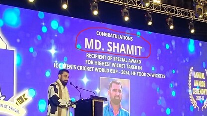 শনিবার মহম্মদ শামিকে সম্বর্ধনা দিতে গিয়ে সিএবি যে কাণ্ডটা করল, তাতে হাসাহাসি পড়ে গেল। মহম্মদ শামির নামের বানানটাই ভুল! মঞ্চে সেই ভুল বানান জ্বলজ্বল করল! নিজের নামের ভুল বানানের সামনে দাঁড়িয়ে বক্তৃতা দিলেন শামি।